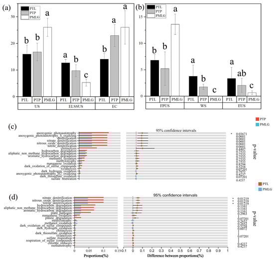 Functional predictive analyses of bacterial communities and bacterial communities. (a,b) FUNGuild functional prediction component difference tests for fungal communities. (c,d) FAPROTAX functional prediction component difference tests for bacterial communities. Notes: The difference notation symbols (such as a, b, c) are used to indicate significant differences among different treatment groups. * indicates a significance level of p < 0.05, ** indicates a significance level of p < 0.01, *** indicates a significance level of p < 0.001. US: undefined saprotroph; ELSSUS: endophyte–litter saprotroph–soil saprotroph–undefined saprotroph; EC: ectomycorrhizal; FPUS: fungal parasite–undefined saprotroph; WS: wood saprotroph; EUS: ectomycorrhizal–undefined saprotroph. PMLG: sanitation cutting treatment group; PTL: Pinus taeda replanting group; PTP: Pinus thunbergii replanting group.