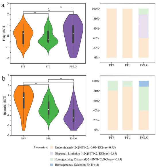 Distribution of β-NTI values for fungal (a) and bacterial (b) community comparisons. Notes: * indicates a significance level of p < 0.05. ns indicates a significance level of p > 0.05. PMLG: sanitation cutting treatment group; PTL: Pinus taeda replanting group; PTP: Pinus thunbergii replanting group.