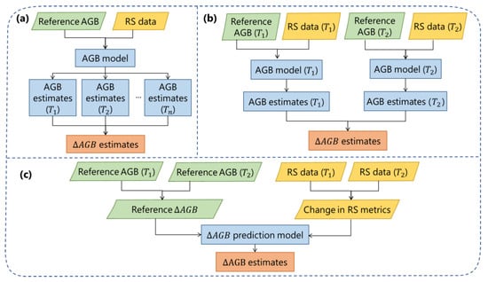 Direct and indirect methods for estimating AGB changes using remote sensing. (a,b) show indirect methods, while (c) illustrates the flowchart for the direct method. T1, T2, …, Tn represent data at different time periods.
