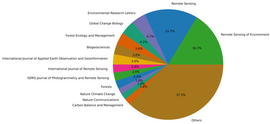 Figure 2 presents the number of annual publications from 2010 to 2024 for the selected 166 articles, highlighting an increase in studies over the past two years. Most publications (62.7%) were sourced from 13 peer-reviewed journals, as shown in Figure 3, with the remaining articles coming from a variety of journals. The two journals with the highest publication counts were Remote Sensing of Environment (16.3%) and Remote Sensing (15.7%), followed by Environmental Research Letters (4.2%) and Global Change Biology (4.2%).