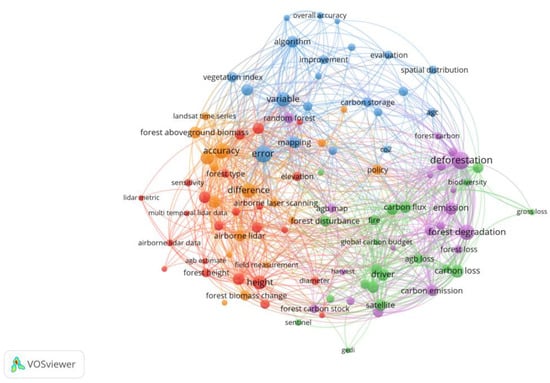 Cluster analysis was performed using VOSviewer version 1.6.20 [104] based on the frequency of terms extracted from the titles and abstracts of the selected articles. The binary counting method was applied, with a minimum occurrence threshold of five for each term. This analysis revealed five distinct research clusters, each corresponding to a key area of focus in forest biomass studies (Figure 4). These clusters were: the red cluster (23 terms), labeled “LiDAR and height”, which focused on the use of LiDAR technology for measuring forest height and biomass; the blue cluster (21 terms), labeled “Accuracy (concerned with accuracy in forest biomass mapping, including algorithms, variables, and methods for biomass estimation)”; the green cluster (20 terms), labeled “Biomass and carbon loss”; the purple cluster (19 terms), labeled “Disturbance (focusing on deforestation and forest degradation and their role in biomass loss)”; and the orange cluster (17 terms), labeled “Forest biomass and biomass change: accuracy, difference, and prediction”. The most frequently cited term in each cluster was “height” (22 occurrences), “error” (31 occurrences), “carbon loss” (20 occurrences), “deforestation” (33 occurrences), and “accuracy” (26 occurrences), respectively.