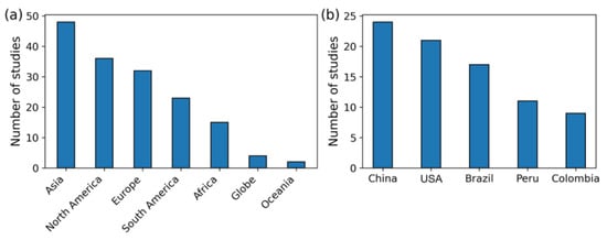 Spatial distribution of biomass change studies by geographical region: (a) continent- and (b) country.