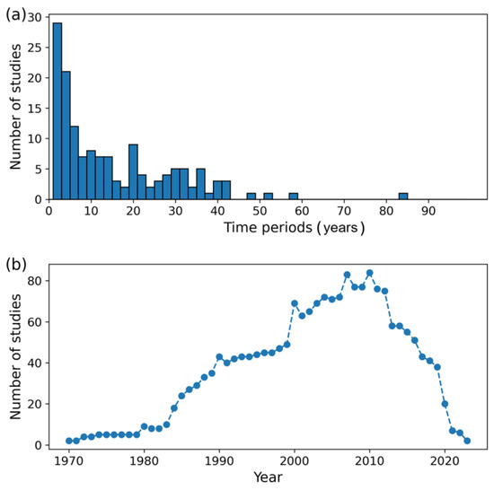 Temporal coverage (a) and temporal distribution (b) of biomass change studies.