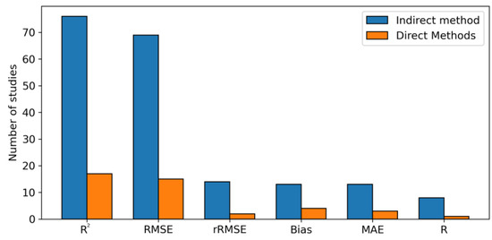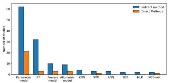 Methods for estimating forest AGB changes using multi-temporal remote sensing data can be broadly categorized into two approaches: direct estimation and indirect estimation (Figure 1). Among the selected literature, 116 articles employed indirect methods to estimate biomass change, 25 used direct methods, and 13 compared both approaches.