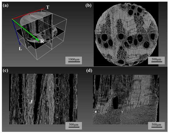 XCT image and trisection of the 3D structure of oak: (a) micron-scale image of the 3D structure of the specimen; (b) micron-scale image of the T-R oriented structure; (c) micron-scale image of the T-L oriented structure; (d) micron-scale image of the R-L oriented structure.