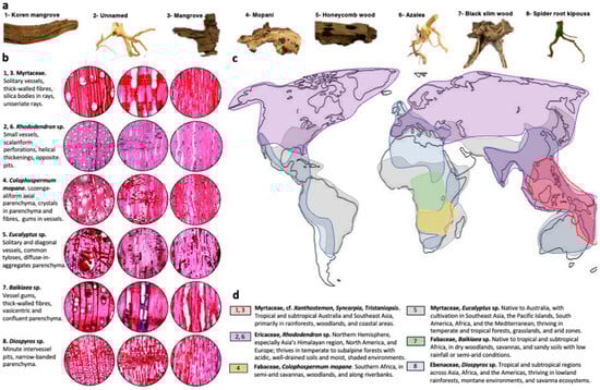 A detailed examination of the samples labelled mangrove (Samples 1 and 3, Figure 1a) revealed that they were not true mangrove species (e.g., Rhizophora sp. or Avicennia sp.), as they lacked included phloem, a characteristic anatomical feature of mangrove wood visible to the naked eye. Microscopic analysis revealed that both samples had matching anatomical features (Figure 1b) and belonged to the Myrtaceae family, although a precise genus identification was not possible (Table 1). Sample 4, labelled mopani (Figure 1a), exhibited macroscopic characteristics consistent with Colophospermum mopane, a tree native to Southern Africa. This identification was corroborated by microscopic analysis (Figure 1b). Sample 6, labelled Azalea, and Sample 2, which lacked a label (Figure 1a), were identified as belonging to the genus Rhododendron (Table 1, Figure 1b). The label Azalea was consistent with the taxon, as it is a common term used to describe plants of this genus. The remaining samples (5, 7, and 8) were labelled with fanciful names: “honeycomb wood”, “black slim wood”, and “spider root kipouss”, respectively (Figure 1a). These names could not be linked to specific taxa. The microscopic analysis identified the samples as Eucalyptus (Sample 5), Baikiaea (Sample 7), and Diospyros (Sample 8), representing a wide geographic and ecological range (Table 1, Figure 1b).