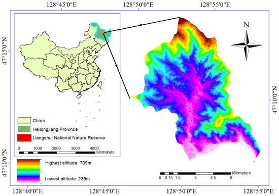 The study site of this paper is the Liangshui Experimental Forestry Farm (Liangshui National Nature Reserve) of Northeast Forestry University, which is located on the eastern slope of the Dali Dailing Branch, the southern section of the Xiaoxinganling Mountain Range in the eastern mountains of northeastern China, with a total area of 12,133 ha, and the geographic coordinates of longitude from 128°47′8″ to 128°57′19″, latitude between 47°6′49″ and 47°16′10″ (Figure 1). The zonal vegetation of Liangshui Experimental The forest is a temperate mixed coniferous and broad-leaved forest, in which Korean pine serves as the dominant tree species [42], which has greater typicality and representativeness. The species composition of the original Korean pine forest is dominated by Korean pine, accompanied by a variety of temperate broadleaf species, such as Tilia, Betula, Ulmus laciniata, etc., up to more than 20 species.