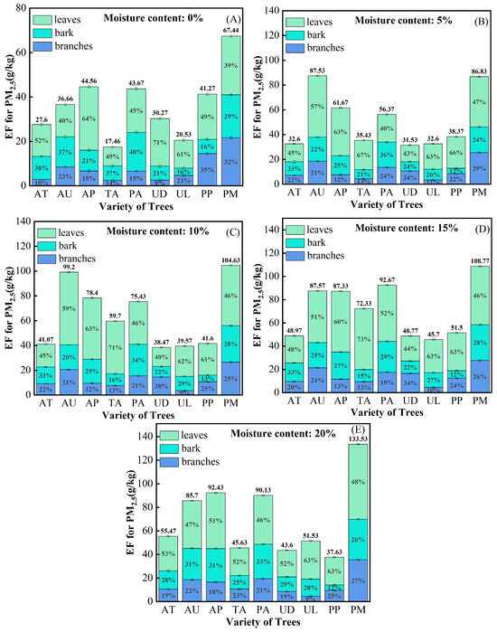 In this paper, the total amount of PM2.5 emitted from the combustion of each tree part under different moisture content states of the fuel was compared. Figure 3 comprises five panels (A–E), each depicting the total PM2.5 emissions from different tree parts at varying moisture content levels tested in the experiments. The percentage values in the figures represent the proportional contribution of each component. From Figure 3, we can see Acer tegmentosum (AT), Acer ukurunduense (AU), Acer pictum (AP), Tilia amurensis (TA), Phellodendron amurense (PA), Ulmus davidiana (UD), Ulmus laciniata (UL), Prunus padus (PP), Prunus maackii (PM) of PM2.5 emission rules. Upon comprehensive examination, it was determined that there are considerable variations in the emission of PM2.5 resulting from the combustion of various broadleaf trees, as well as notable differences in PM2.5 emissions from distinct sections of the same species. The species with higher PM2.5 emission were Prunus maackii (PM), Acer ukurunduense (AU), Acer pictum (AP), Phellodendron amurense (PA); several other tree species released less PM2.5. The total amount of PM2.5 emission by each species was lowest at 0% moisture content, and the total amount of PM2.5 emission by each species was highest at 15% moisture content. At equivalent moisture levels, Ulmus laciniata (UL) exhibited the lowest total PM2.5 emissions, whereas Prunus maackii (PM) displayed the highest. For branches of the same species, the total PM2.5 emissions were notably lower, generally constituting less than 30% of the overall emissions; conversely, leaves emitted the greatest quantity of PM2.5, typically exceeding 40% of the total emissions [3].