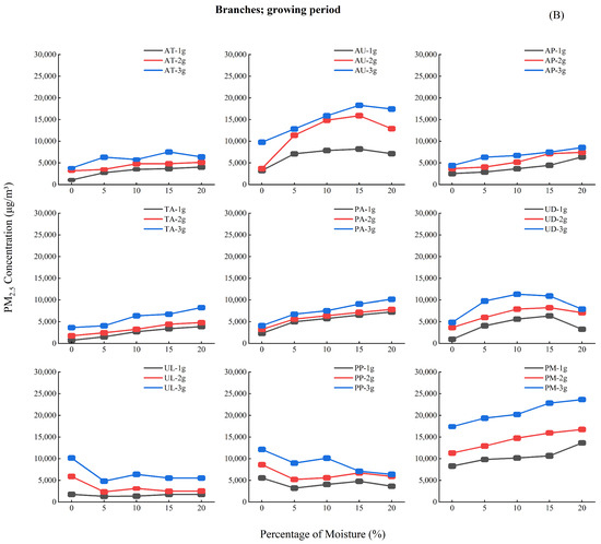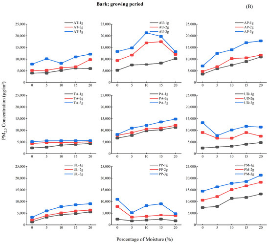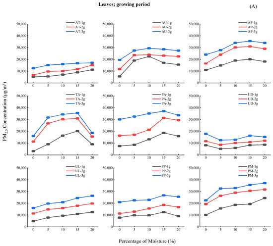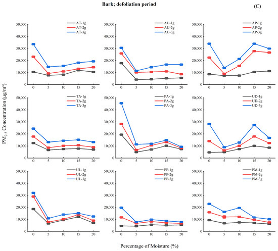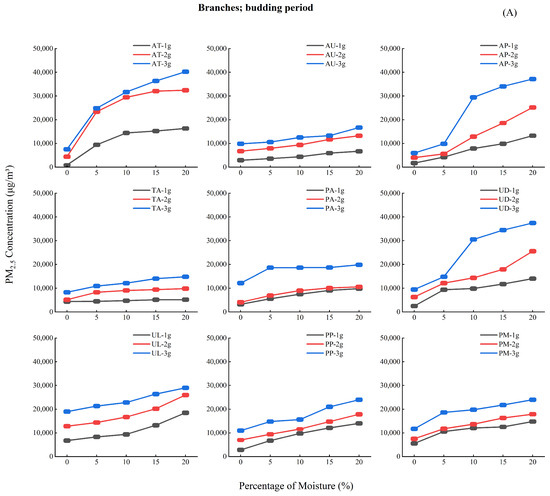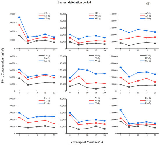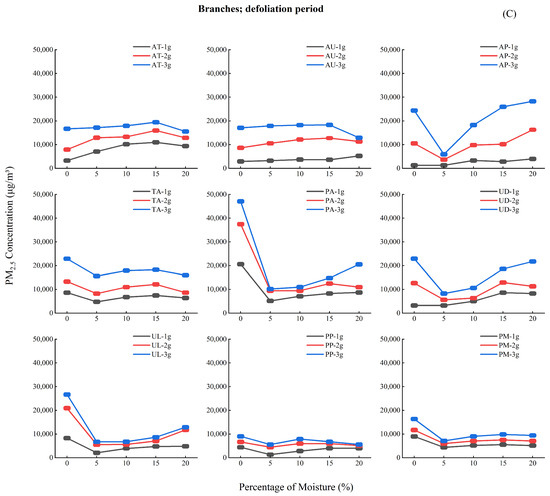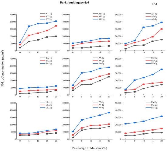 Analysis of Figure 4 reveals three key moisture-dependent emission patterns: (1) During the budding period (A), PM2.5 concentrations increased progressively (0%–20% moisture), peaking at 15%–20%; (2) The growth period (B) showed an initial decline (0%–5%), subsequent rise (5%–10%), and stabilization (10%–20%) of PM2.5 emission; (3) The leaf fall period (C) exhibited similar but more pronounced (30%–40% greater amplitude) triphasic fluctuations.
