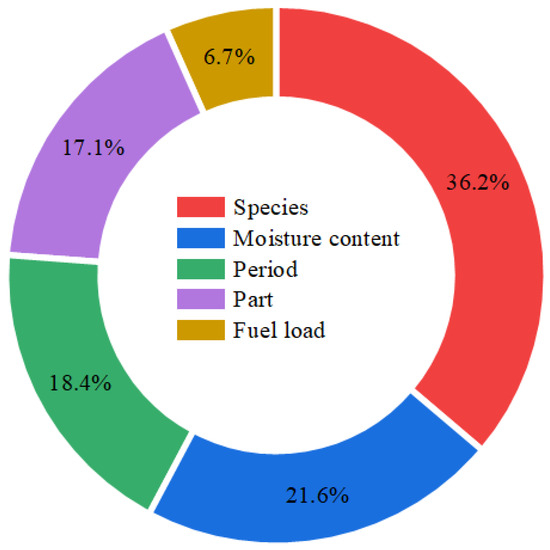 Figure 8 presents the feature importance analysis from the LightGBM regression model, highlighting significant variations in individual feature contributions to the prediction performance. Notably, the feature importance of tree species, at 36.2%, underscores its paramount role in the model’s predictive capabilities, serving as the central factor in explaining variations in the target variables. This was closely followed by moisture content with 21.60% importance, showing that this characteristic has a significant impact on the model and its variation is able to predict the results. The significance of temporal and locational characteristics was determined to be 18.40% and 17.10%, respectively. Although these values were lower than those for tree species and moisture content, they remained significant predictors that should not be overlooked. Their contribution to the model’s predictive capacity was notably substantial, highlighting the impact of temporal and locational factors on the target variable. In comparison, the contribution of fuel load was found to be merely 6.7%, the smallest among the listed characteristics. This suggests that, within the current model and dataset, the direct influence of fuel load on the predictive outcomes is relatively minor.