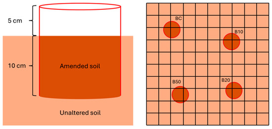 (Left) Schematic representation of a pot with a plastic cylinder inserted into the soil which contains the amended soil. (Right) Illustration of a plot protected by a 10 × 10 cm2 iron net covering the four cylinders: BC (control; mixed soil only), B10 (10% biochar), B20 (20% biochar), and B50 (50% biochar).