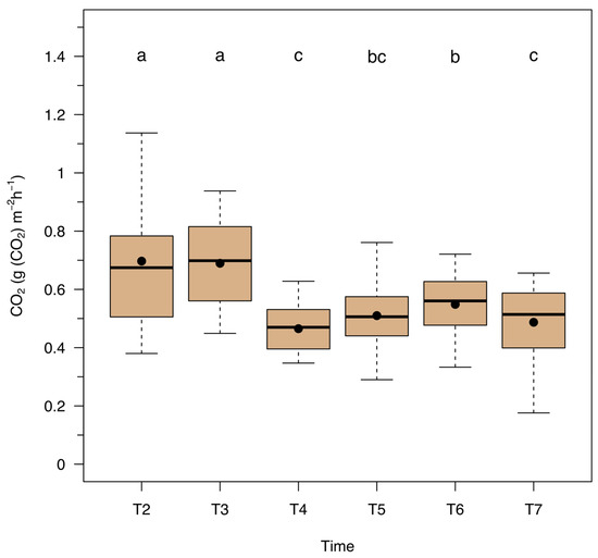 Respiration (g (CO2) m−2 h−1) of European beech forest soil samples amended in the field with different biochar application percentages according to monitoring times: T2 = 27 June 2023, DOY 178; T3 = 11 July 2023, DOY 192; T4 = 26 July 2023, DOY 207; T5 = 8 August 2023, DOY 220; T6 = 8 September 2023, DOY 251; T7 = 6 October 2023, DOY 279. Black dots indicate the average values. Different letters indicate significant differences between dates (post-hoc contrast, p < 0.05).