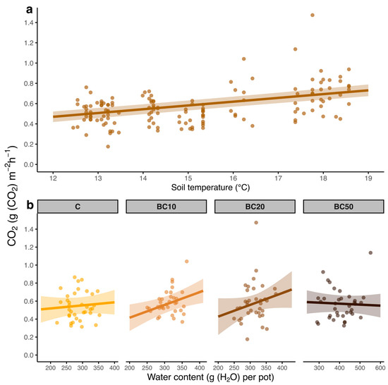 Soil respiration was positively affected by soil temperature (p < 0.001; Figure 3a) but was not influenced by water content (p = 0.4736). However, a positive effect of water content on soil respiration was observed following 10% and 20% BCH treatments (p = 0.0335; Figure 3b).