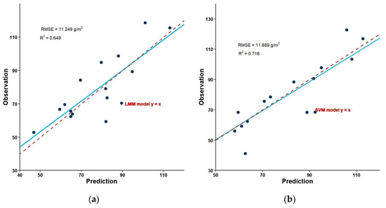 When the top-layer LMA is less than 125 g/m2, the model exhibits relatively stable prediction variability. Additionally, the predicted LMA values for the lower layer are generally lower than the observed values. The overall trend aligns with findings from previous studies, indicating that the model can be effectively used for large-scale predictions.