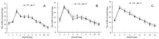 (A) Effects of different treatments on the width of annual rings in the bottom part of the tree. (B) Effects of different treatments on the width of annual rings in the middle part of the tree. (C) Effects of different treatments on the width of annual rings in the top part of the tree.