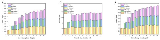Wood disks were cut from the pith outward in annual rings and numbered sequentially, with the northward direction marked during the harvest. To determine the annual ring widths, a 2 cm wide central section was first extracted. A straight line was drawn from the pith in the northward direction. A growth ring micrometer was used to measure the width of each annual ring, with an accuracy of 0.01 mm. Each sample was cut into small strips, with three replicates prepared for each growth ring. The samples were immersed in deionized water and heated in a 90 °C water bath until fully submerged. After decanting the water, a mixture of glacial acetic acid and hydrogen peroxide (1:1) was added and boiled until the samples turned white. After cooling, the samples were rinsed with deionized water until reaching a neutral pH. The samples were then suspended in deionized water to separate the wood fibers, and a portion of the fibers was placed on a slide for microscopic examination. The fiber length, width, and aspect ratio were measured using an optical microscope (BX51, Olympus, Tokyo, Japan).
