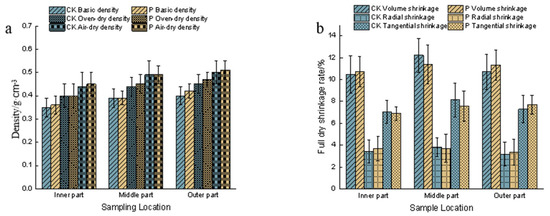 The densities and oven-dried shrinkages of both the control and the pruned samples from the inner part to the outer part of the tree samples. (a) Density variation at different positions before and after pruning. (b) Density shrinkage rates at different positions before and after pruning.