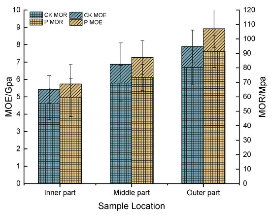 This study concluded that pruning could improve the bending and compressive strength of poplar wood but reduce its impact toughness. The trend of the MOE generally matched that of the MOR. Pruning significantly improved the MOE and the MOR at the outer part of the trunk but reduced the impact toughness of wood at different radial positions compared to the control. Huang et al. [37] found that the bending strength and the MOE of pruned red pine were significantly higher than those of the control. Pruned C. lanceolata showed a higher bending strength and MOE than the control, but lower impact toughness, with a more pronounced decrease in toughness with increased pruning intensity [36,48]. The order of the tree parts with regard to their bending and compressive strength was generally outer > middle > inner part.