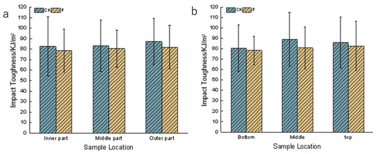 Impact toughness measures the maximum energy absorbed by wood before breaking under an impact force, indicating wood’s ability to withstand sudden shocks and its overall toughness. In this work, the impact toughness of pruned poplar wood was generally lower compared to unpruned wood across different distances from the pith, as shown in Figure 5a, with decreases of 5%, 3.6%, and 6.3%, for the inner, middle, and outer parts, respectively. The differences were not statistically significant though (p > 0.05). Along the tree height, for the control, the impact toughness increased from the bottom to the middle, then decreased in the top part, as shown in Figure 5b. However, for the pruned trees, the impact toughness remained relatively stable at around 80 kJ·m2 at different heights. The impact toughness of the pruned trees decreased by 2.6%, 9.4%, and 3.4% at the bottom, middle, and top parts, respectively.