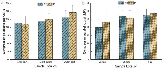 Data processing was performed using Origin Pro 2017 software (Northampton, MA, USA). The statistical analysis was conducted using t-tests in SPSS 26.0 software (Armonk, NY, USA). Each of the wood properties was measured and averaged, and the significance of differences between the P and CK treatments was tested using t-tests. Prior to conducting the statistical analysis, tests for the normality and homogeneity of variances were performed.
