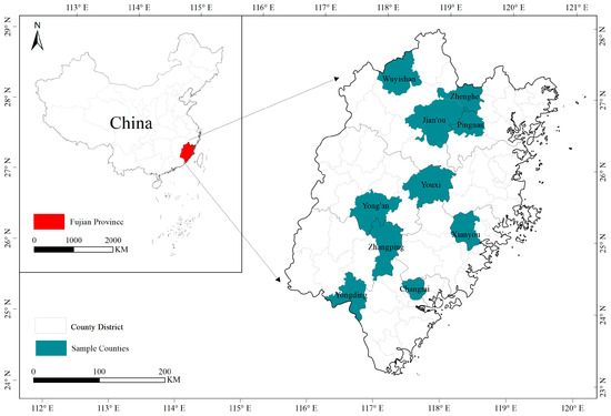 The data used in this study are primarily derived from the “Monitoring of Collective Forest Tenure Reform” project, a major research initiative organized by the National Forestry and Grassland Administration of China. This government-led investigation focuses on tracking the progress of collective forest tenure reform across several provinces, including Fujian and Jiangxi. Some existing studies have utilized data collected from other regions within this monitoring program [45]. Fujian was one of the earliest regions in China to explore reforms of the collective forest tenure system and is also the province with the highest forest coverage in the country, making forestry households in Fujian a representative sample. Using a typical sampling method, our research team identified 10 forest resource-rich counties with forestry reform monitoring in Fujian—namely Wuyishan, Jian’ou, Pingnan, Xianyou, Yong’an, Yongding, Youxi, Zhangping, Changtai, and Zhenghe. From each county, 50 forestry households were randomly selected as fixed samples, resulting in a total of 500 households, which were then tracked annually over a six-year period from 2013 to 2018. The survey region is shown in Figure 1. However, due to issues such as the unavailability of sample households during field visits, the research team adjusted the sample size. The six-year survey ultimately produced an unbalanced panel dataset involving 1174 different forestry households, of which 58% participated in at least two survey rounds. A total of 2780 valid questionnaires were collected, all through face-to-face interviews conducted by students from Fujian Agriculture and Forestry University.