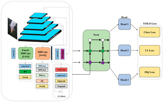 Architecture of the proposed YOLOv4-EfficientNetV2-ECA-based forest fire detection framework. The model uses an EfficientNetV2 backbone with Fused-MBConv and MBConv blocks, enhanced by Efficient Channel Attention (ECA) to emphasize informative features. Low-level and high-level features extracted from the input (240 × 240 RGB image) are passed through a PANet-based neck for multi-scale feature fusion. The network outputs are processed by three parallel detection heads for object classification, bounding box regression (L1 loss), and objectness score prediction. The legend below shows the specific modules used, illustrating the lightweight yet expressive design tailored for real-time wildfire monitoring on edge or UAV platforms.