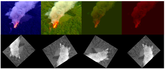 The preprocessing strategy employed in this study involves a comprehensive and structured pipeline aimed at optimizing the forest fire dataset for high-performance deep learning. The dataset consists of both still images and frames extracted from forest fire video sequences captured under varying environmental and sensor conditions. Initially, all visual inputs are subjected to a rigorous normalization process, standardizing pixel intensity values to reduce inconsistencies caused by fluctuating illumination, weather conditions, and heterogeneous camera sources. This is followed by a suite of data augmentation techniques designed to enhance dataset diversity and mitigate the risk of model overfitting. As shown in Figure 2, these augmentations include random rotations, horizontal and vertical flipping, scaling transformations, and color filtering, each of which introduces controlled variability that mirrors real-world fire scenarios.