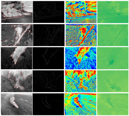 Examples of the composite domain-aware preprocessing pipeline applied to forest fire imagery. Each row represents a different input image processed through three specialized filters: (1) Canny edge detection (second column) enhances structural boundaries such as smoke contours and flame edges; (2) CLAHE with Jet colormap (third column) amplifies contrast and heat-related visual features, aiding fire texture recognition under haze or low lighting; and (3) pseudo-NDVI mapping (fourth column) highlights vegetation stress and potential burn areas based on visible-spectrum approximations of NDVI. The leftmost grayscale images with red masks denote the original frames used to guide segmentation overlays. These preprocessing techniques collectively increase feature salience and support the model’s robustness in diverse environmental conditions.