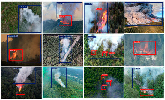Qualitative detection results of the proposed model on various test samples containing forest fire and smoke scenarios. The bounding boxes indicate model predictions, with red boxes denoting detected fire regions and blue boxes indicating smoke. The confidence scores are shown within each box. The images illustrate the model’s robust performance across diverse scenes, including dense vegetation, varying fire intensities, complex smoke plumes, and partially occluded environments. The model demonstrates strong discrimination between flame and smoke features, achieving high-confidence predictions in real-world forest conditions. These results validate the model’s generalization capability and real-time applicability in UAV-based wildfire surveillance.