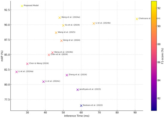 Performance comparison of the proposed model with existing state-of-the-art forest fire detection models in terms of inference time (ms), mAP (%), and F1-score (%). Models included in this evaluation are: Chen et al. (2024) [13], Li et al. (2024a) [17], Li et al. (2024b) [18], Li et al. (2024c) [33], Wang et al. (2024a) [19], Wang et al. (2024b) [32], Wang et al. (2025) [30], Chen and Wang (2024) [20], Zheng et al. (2024) [25], Jandhyala et al. (2023) [29], Xu et al. (2024) [34], Kong et al. (2024) [35], Cheknane et al. (2024) [28], and Baskara et al. (2022) [31]. The proposed model achieves the highest precision, recall, mAP, and F1-score with the lowest inference time, indicating superior performance and suitability for real-time wildfire detection applications.