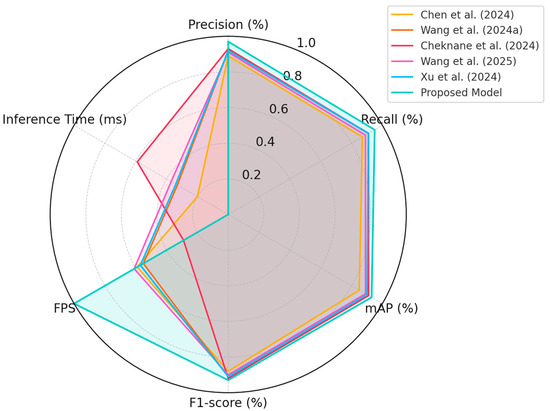 Radar chart comparing six representative forest fire detection models. Radar chart comparison of six forest fire detection models across precision, recall, mAP, F1-score, FPS, and inference time. The models include: Chen et al. (2024) [13], Wang et al. (2024a) [19], Cheknane et al. (2024) [28], Wang et al. (2025) [30], Xu et al. (2024) [34], and the Proposed Model. The Proposed Model demonstrates leading performance in most categories, especially in inference efficiency and detection accuracy, making it optimal for real-time wildfire detection.
