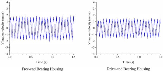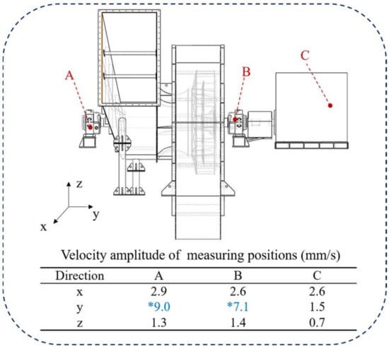 Figure 9 presents the measured axial vibration velocity of the bearing housings under the improved operating conditions. It can be observed that the axial vibration velocity of both bearing housings significantly decreased compared to the pre-optimization state. The vibration acceleration amplitude was reduced to below 2 mm/s, meeting the requirements for normal operation, while also enhancing the operational stability and service life of the equipment. These results validate the effectiveness of the optimization strategy and methods proposed in this study. By minimizing structural modifications, the performance of the induced draft fan was significantly improved at the lowest possible cost.