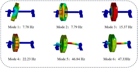 Figure 5 also presents the modal analysis results of the simplified model when all structural parameters are set to their initial values. Compared to the modal analysis results of the original rotating components in