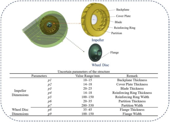 Figure 4, need to be considered. Nine key geometric parameters of the impeller and wheel disc were selected as optimization variables. These parameters were treated as uncertain parameters to construct an uncertainty parameter model for subsequent optimization. An interval model was employed to describe these uncertain parameters, with their upper and lower bounds listed in