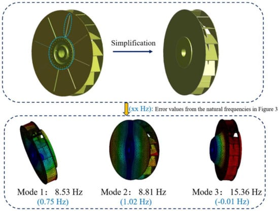 Figure 3 and the operating speed of the fan, the first three modal frequencies of the rotating components were identified as the key modes to focus on during structural optimization. Since the mode shapes of these three modes primarily involve deformations of the impeller and wheel disc, computational costs during parameter optimization can be reduced by simplifying the model. In this simplification process, only the impeller and wheel disc were retained, while further geometric refinements were performed, such as removing threaded holes, grooves, and other small features. Additionally, the displacement and rotational degrees of freedom of the inner hole surface of the wheel disc were constrained, resulting in a simplified model, as shown in