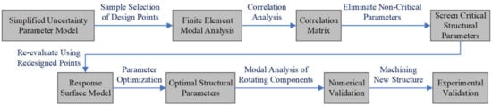 For the structural optimization of the induced draft fan, a simplified uncertainty parameter model was established in the previous section, and nine structural parameters that potentially affect the natural frequencies were selected. The range of values for each parameter was defined as an interval, reflecting the inherent uncertainty. This step provides a comprehensive uncertainty framework for optimization analysis. The overall optimization process is illustrated in