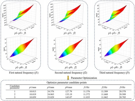 Figure 8. By comparing these three sets of candidate parameters, it was observed that the structural natural frequencies remained consistent across all three cases. The first two natural frequencies were in the range of 11–12 Hz, while the third natural frequency was in the range of 20–21 Hz. In terms of natural frequency values, all three sets of parameters successfully ensured that the first two natural frequencies remained low while simultaneously increasing the third natural frequency, moving it further away from the operating frequency. Examining the numerical values of the three sets of optimized parameters, p
