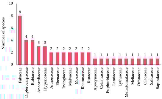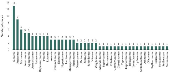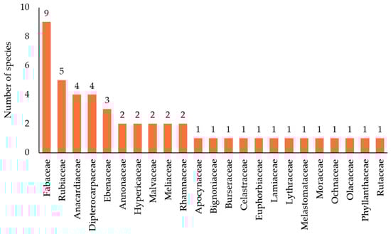 A total of 110 species, representing 42 families, were identified in the Khanthararat Public Benefit Forest (Table 1 and Figure 2). The Fabaceae family had the highest number of species, with 13 species, followed by the Rubiaceae family, which contained 9 species. The Malvaceae family had six species, while the Annonaceae and Apocynaceae families each had five species. The Anacardiaceae, Asteraceae, Dipterocarpaceae, Poaceae, and Rutaceae families each contained four species.