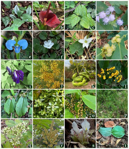 Photographs of some species found in the Khanthararat Public Benefit Forest, Kantarawichai District, Maha Sarakham Province, Thailand: (a) Scindapsus officinalis, (b) Typhonium trilobatum, (c) Chromolaena odorata, (d) Praxelis clematidea, (e) Commelina diffusa, (f) Evolvulus nummularius, (g) Coccinia grandis, (h) Suregada multiflora, (i) Clitoria ternatea, (j) Peltophorum dasyrhachis, (k) Pithecellobium dulce, (l) Pterocarpus macrocarpus, (m) Microcos tomentosa, (n) Azadirachta indica, (o) Antidesma puncticulatum, (p) Vietnamosasa pusilla, (q) Micromelum minutum, (r) Lepisanthes rubiginosa, (s) Curcuma singularis; (t) Kaempferia marginata. Photographs (d,e,h,j,q,r) by T. Jitpromma; all other photographs by T. Boonma.