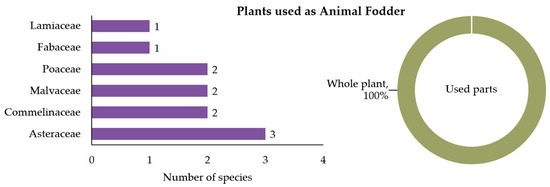The Khanthararat Public Benefit Forest community utilizes a variety of herbaceous plant species as animal fodder (Table 1 and Figure 4), reflecting both ecological richness and traditional knowledge. A total of 11 species, classified under 10 genera and 6 families, were identified for this purpose. The Asteraceae family was the most frequently represented with three species, followed by Commelinaceae, Malvaceae, and Poaceae, each contributing two species, while Fabaceae and Lamiaceae were represented by one species each. Remarkably, all recorded species were used in their entirety, with 100% of them harvested as whole plants for fodder.