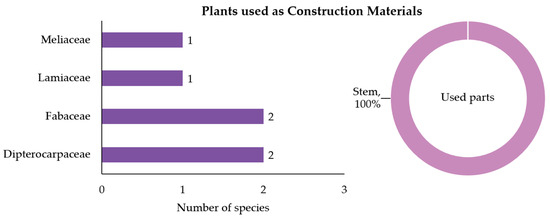 Within the Khanthararat Public Benefit Forest community, six tree species are traditionally utilized for construction purposes (Table 1 and Figure 5), spanning four families and six genera. The Dipterocarpaceae and Fabaceae families were the most represented, each contributing two species, while Lamiaceae and Meliaceae contributed one species each. Notable species include Anthoshorea roxburghii, Chukrasia tabularis, Peltophorum dasyrhachis, Pentacme siamensis, Sindora siamensis, and Vitex pinnata, all valued for their durable wood. In all cases, the stem was the exclusively used plant part, accounting for 100% of construction-related use. This selective use of stem wood highlights the significance of these species as key sources of structural timber within the community’s traditional practices.
