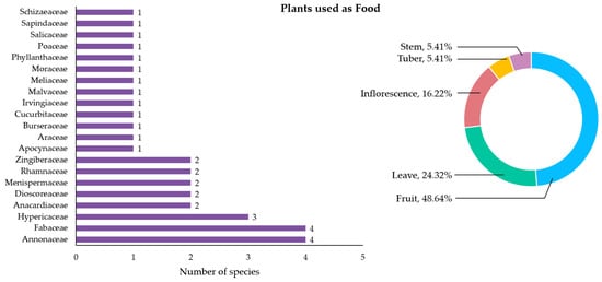 Local plant biodiversity serves as an essential source of food for the Khanthararat Public Benefit Forest community, with 34 wild edible species documented across 29 genera and 21 families (Table 1 and Figure 6). The most represented families were Annonaceae and Fabaceae, each contributing four species, followed by Hypericaceae with three species. Families such as Anacardiaceae, Dioscoreaceae, Menispermaceae, Rhamnaceae, and Zingiberaceae each included two species, while several others—including Apocynaceae, Araceae, Cucurbitaceae, and Salicaceae—were represented by a single species. Regarding plant parts utilized, fruits were the most commonly consumed (48.64%), followed by leaves (24.32%), inflorescences (16.22%), and stems and tubers (each at 5.41%). This diversity underscores the forest’s vital role as a food source and reflects the community’s extensive knowledge of seasonal availability and the sustainable use of native plant resources.