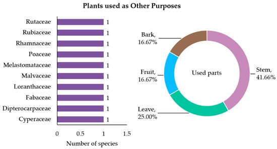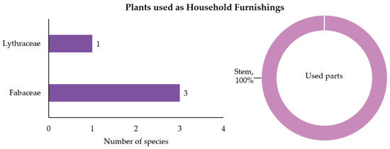 Within the context of household furnishings, several plant species are traditionally used, with a focus on durable woods sourced from their stems. These plants span multiple families, with the Fabaceae and Lythraceae families being the most represented (Table 1 and Figure 7). The Fabaceae family comprises three species, including Peltophorum dasyrhachis, Pterocarpus macrocarpus, and Xylia xylocarpa, all valued for their strong and resilient wood, making them ideal for furniture construction. The Lythraceae family adds one species, Lagerstroemia balansae, also prized for its sturdy wood, suitable for creating durable household furnishings. In total, four species provide materials for household furnishings. These species belong to two families: Fabaceae and Lythraceae. The stem is the exclusively used plant part, accounting for 100% of utilization (Figure 5). This highlights the importance of these plant species in providing essential materials for crafting robust and long-lasting furniture and home decor. The selective use of stems for their strength and versatility underscores their central role in traditional household furnishing practices.