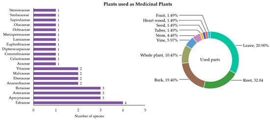 Analysis of the plant parts used for medicinal purposes revealed that the root was the most commonly utilized part, accounting for 32.84% of all reported uses (Figure 9). This was followed by the leaves (20.90%) and bark (19.40%), indicating a strong preference for underground and woody plant components in traditional preparations. The whole plant was used in 10.45% of cases, suggesting a holistic approach in some remedies.