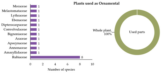 The Rubiaceae family stands out with the highest representation, comprising eight species, suggesting its popularity for ornamental purposes—likely due to its attractive flowers, foliage, or growth form. Each of the remaining families—Amaryllidaceae, Annonaceae, Apocynaceae, Araceae, Bignoniaceae, Convolvulaceae, Dipterocarpaceae, Ebenaceae, Lythraceae, Melastomataceae, and Moraceae—is represented by a single species, reflecting a broad yet balanced diversity across plant lineages (Table 1 and Figure 8).