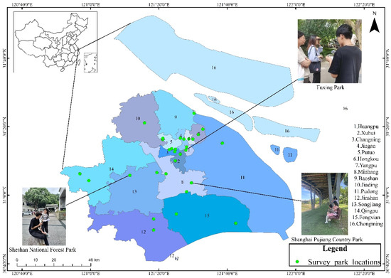 The survey covered 15 administrative districts in Shanghai, except for Chongming District, and 2–3 comprehensive parks, city parks, and country parks were sampled in each administrative district. The questionnaires were completed face-to-face through on-site distribution, interviews, filling, and on-site recovery, with 30–40 questionnaires distributed in each park. Stratified random sampling techniques were also used to ensure that all population levels were represented, with quotas for each age, educational level, gender, household registration and income level. This ensured that the sample was broadly sourced, evenly distributed, and better matched the actual situation of the urban public (Figure 3).