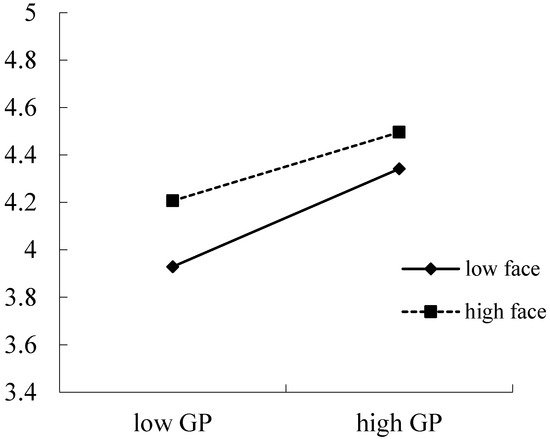 In order to test the moderating effect of face, regression was conducted according to Equation (4), and the empirical regression result is shown in Table 2. According to model (4), the coefficients of both green perception (GP) and the Chinese concept of face (face) were significantly positive ( 0.307, p < 0.001, 95% CI [0.245, 0.369]; 0.147, p < 0.001, 95% CI [0.101, 0.193]), and the coefficient of the interaction term of green perception and face (GP × face) was −0.0733, which was still significant at 1%. These indicate that both green perception and face alone can promote pro-greenspace behavior, but face has a negative moderating effect in the influence of residents’ green perception on pro-greenspace behavior, suggesting a substitution relationship between green perception and face.