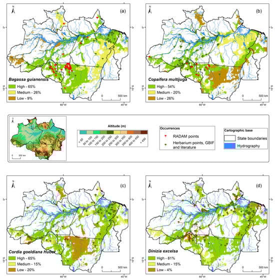 Topoclimatic zoning maps (a–d) of the following species in anthropized areas of the Legal Amazon.