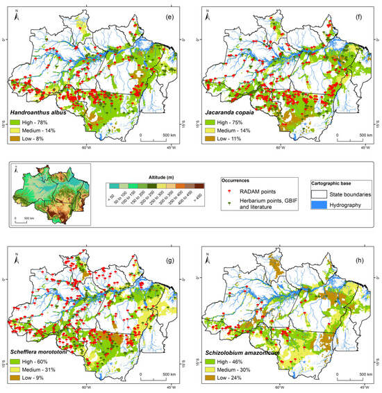 Topoclimatic zoning maps (e–h) of the following species in anthropized areas of the Legal Amazon.