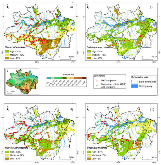 Topoclimatic zoning maps (i,j,l,m) of the following species in anthropized areas of the Legal Amazon.